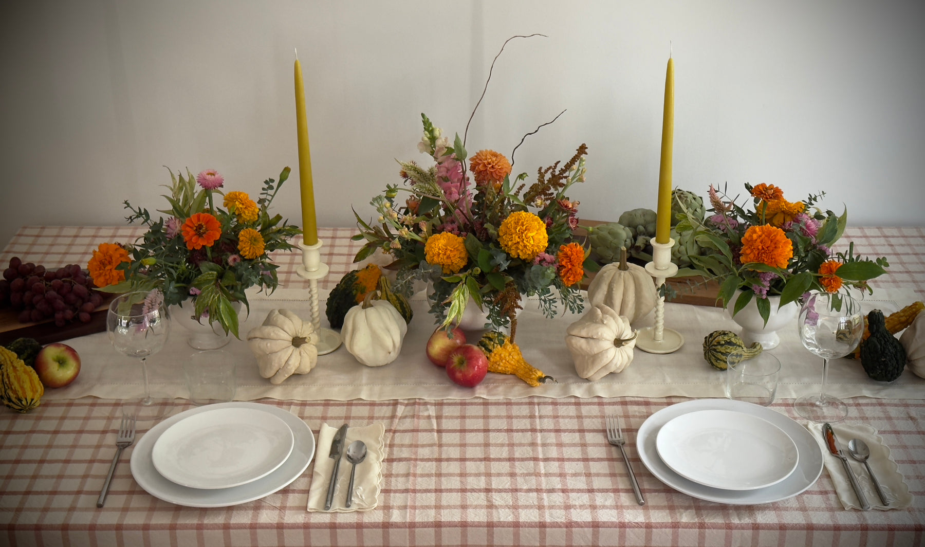 Thanksgiving themed floral centerpieces with candles and white plates