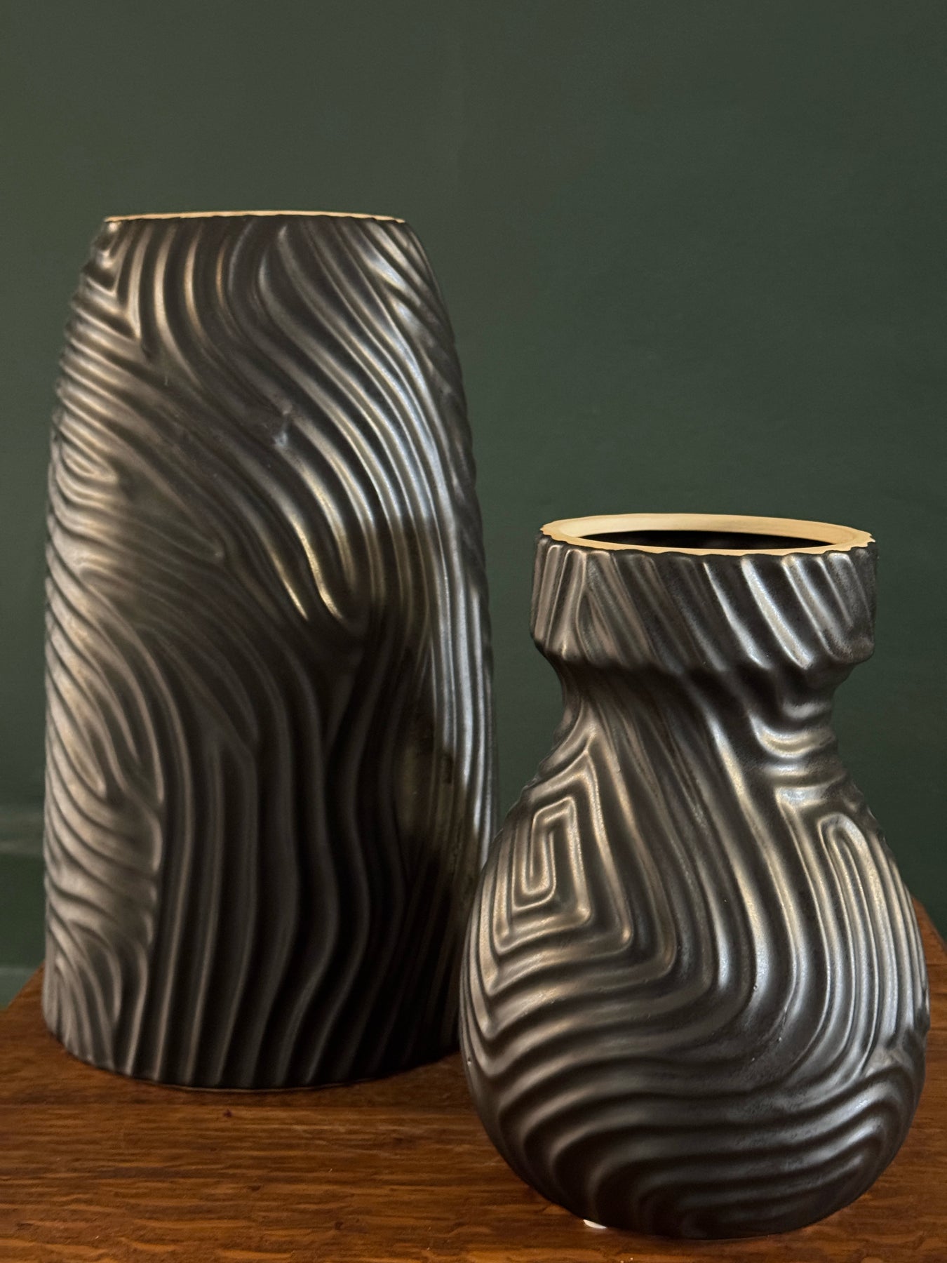 A matte black vase with a wave-like pattern displayed against a dark background.